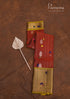 A unique dusty red saree with elegant silver and gold zari stripes and motifs. The saree is complemented by a rich lime green border and pallu, which is intricately woven with gold zari, offering a sophisticated and detailed look.