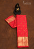 A bright vermillion red saree with a simple body adorned with elegant gold zari buttas. The saree has a wide gold borderand pallu, featuring traditional paisley and floral motifs, making it a classic and timeless choice.