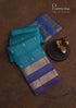 A stunning teal-colored saree with a fine checkered pattern and gold buttas. The saree is bordered by a beautiful royal blue, which is richly woven with traditional gold zari designs, creating a sophisticated and striking combination.