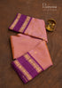 A delicate soft peach saree with small, scattered gold zari buttas. The broad royal purple border and pallu are adorned with traditional gold zari designs, creating a harmonious and sophisticated color combination.